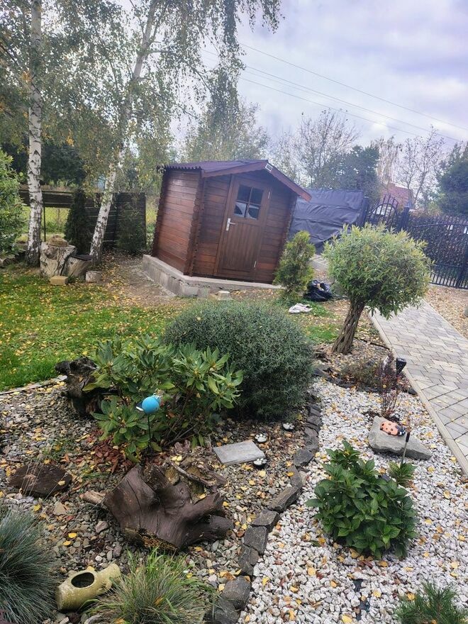 przy domu również stylowy domek drewniany gospodarczy na płycie fundamentowej .